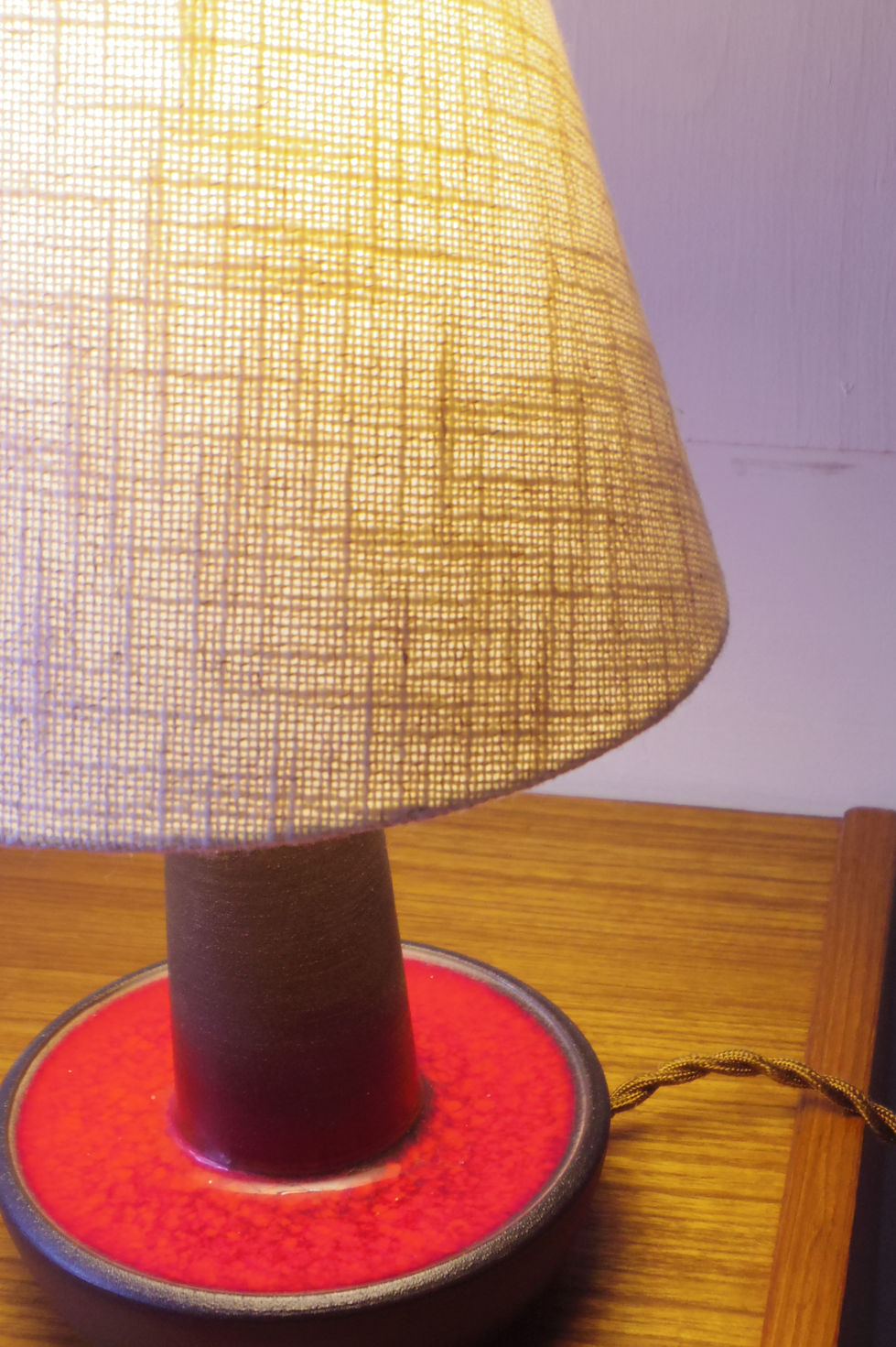 マットなダークブラウンにワンポイントでそれぞれ光沢感のある赤と青をまとった、シンプルでいて個性的なテーブルランプ。