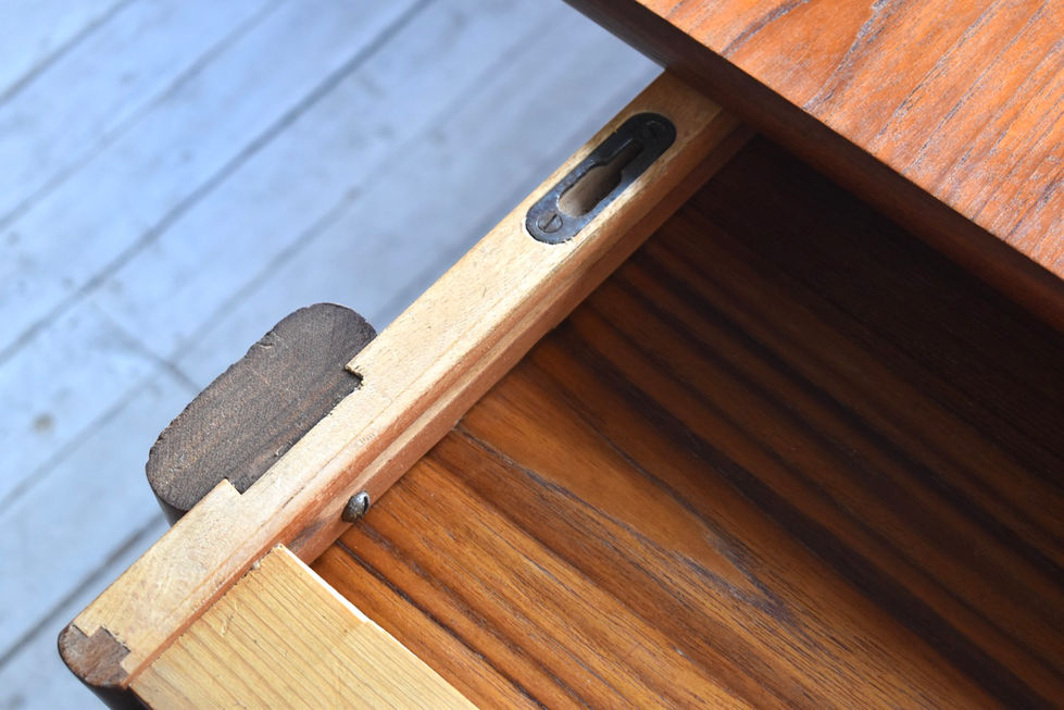 ・幕板の一ヶ所が大きく破損し欠けていた為、チーク無垢材にて成型補修しています。天板下の日常あまり目につく箇所ではありませんが、木目の違いと色の差で容易に判別は出来ると思います。