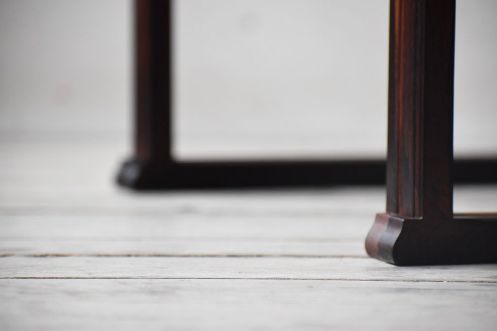 その脚を繋ぐ貫は、強度を考えると通常は脚の中心に配置するのでしょうが、この僅か5㎜幅の貫は脚の中心ではなく端に寄せて配置され、これも各テーブルを収めた際にテーブルがはみ出ることなくぴったりと収まるための、シルエットにこだわった徹底した工夫なのだろうと考えられます。