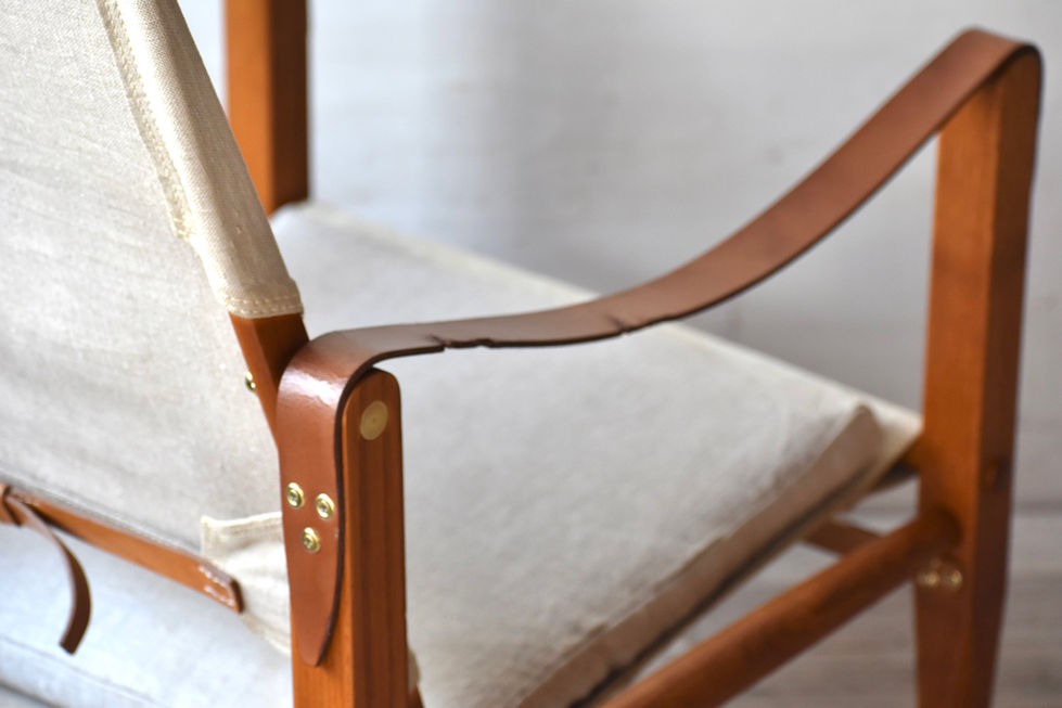 生成りのキャンバス地はやはり汚れが気になったため、シートクッションはウレタン材を取り出してから、背凭れは革ベルトを外してから、全て洗浄をしました。落とせなかった染みや色ムラもありますが、安心してお使い頂けると思います。