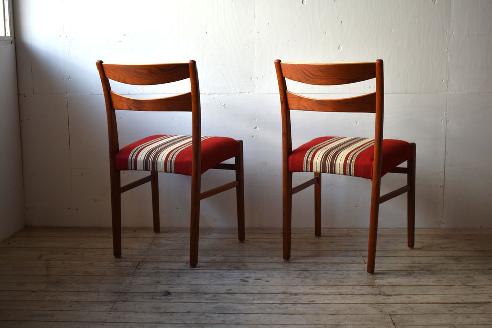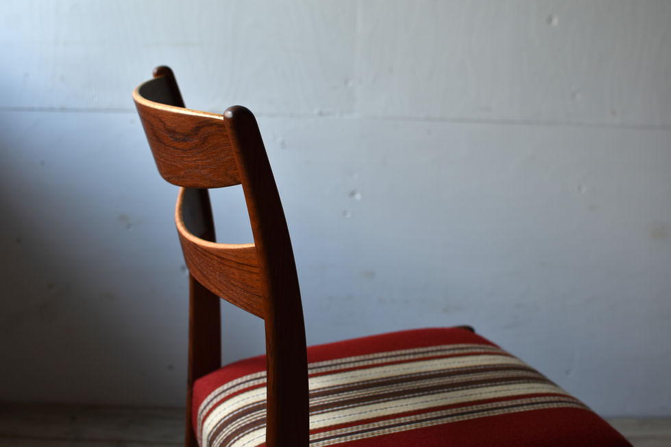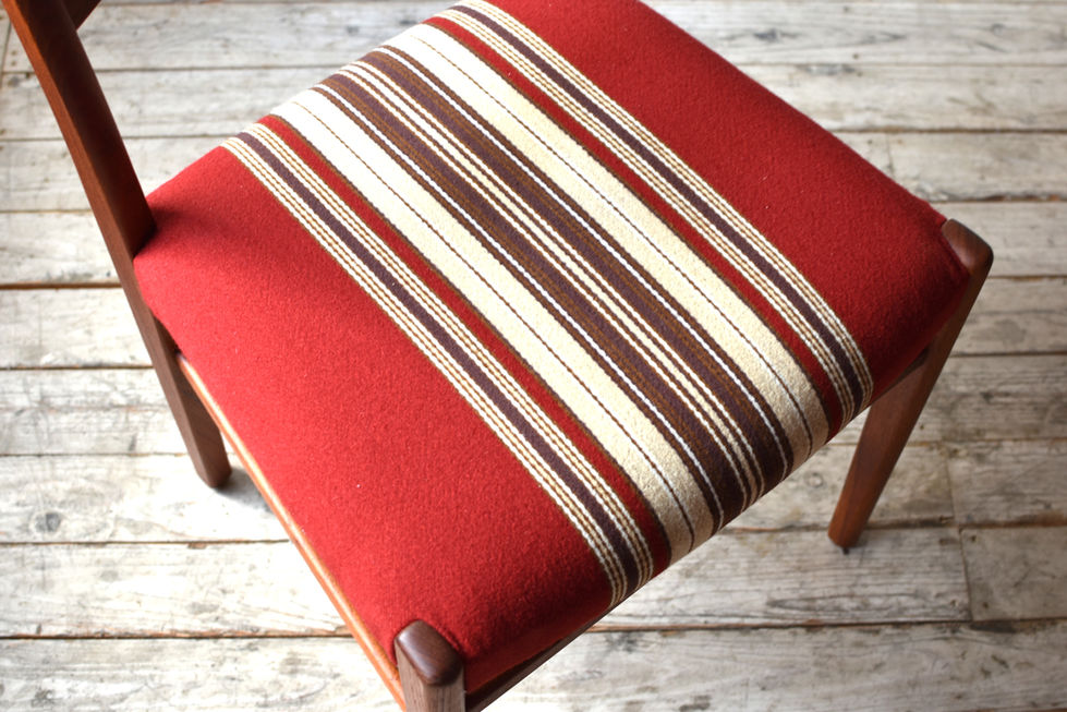 今回シートにはデンマーク Kjellerup Vaeveriより「Storebelt」デンマーク織物の伝統的なパターンを受け継ぐ生地をセレクトして張り替えました。落ち着いた赤色に大胆なストライプ柄が入る一見個性的な生地は、デンマークのヴィンテージ家具との相性良く、少しレトロでとても素敵な生地。