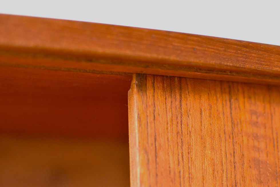 引き戸内部の構成がユニークで、正面向かって左側は広い棚収納、向かって右側には小さな棚とトレイとしても機能する小引き出しが2杯用意されいてるのだが、中央ではなくやや右寄りにおよそ7:3ほどの割合で分割されている。右へ左へと扉を開放した際、いずれにせよ中央付近は扉が遮ってしまうため収納内部を見渡したりモノを出し入れするのにも少し不便な気がするが、このレイアウトにはどのような理由があったのだろうか?当時のデンマーク家具では人体工学や身の回りの様々なモノを計測した特有のスケールをデザインに取り入れているものも多く、何かしら目的があったのかもしれない。詳細は不明であるが、この少し使いづらそうな扉に遮られてしまう収納部分を工夫してどのように活用していくか考えるのも楽しそうです。